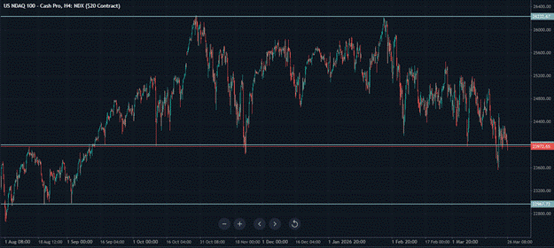 The Nasdaq’s break below 24,000 is the session’s most significant US market development. The level had been holding as a reference point through several sessions of pressure. It’s a break, with the lower lows and lower highs pattern now firmly established, that defines the Nasdaq’s current trajectory as a downtrend rather than a range. The next major support at 23,000 is derived from the August-September period of last year, when the market bounced from those levels multiple times. Whether that historical support proves relevant in the current context depends on whether the conditions that made it support in August and September, principally the absence of a major geopolitical conflict and its associated economic consequences, are remotely similar to Thursday’s environment.