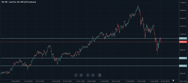 The ending of the FTSE’s uptrend since the conflict began is a meaningful change in the index’s character. For most of the conflict period, the FTSE maintained a constructive underlying structure, supported by its energy sector natural hedge and the upward channel that had defined its trajectory. A double top formation and a broken uptrend have now replaced that channel. If US weakness continues to drag European markets lower, the FTSE’s next identified support level sits at 9,590, a meaningful distance from the current price.