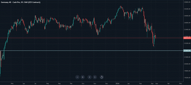 Germany’s specific vulnerabilities compound the technical picture. The energy intensity of German industry, the LNG supply chain exposure, the ECB’s tightening bias, and the extended conflict timeline are all structural headwinds that have accumulated over the conflict period without being addressed. Into the period with no clear support, those headwinds provide no natural floor, and the next identifiable reference point at 21,500 is derived from historical market behaviour rather than current fundamental valuation.