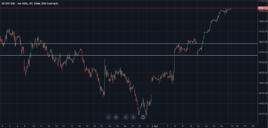 The S&P 500 is consolidating above 7,000. The Nasdaq is holding above 26,000 after 12 consecutive higher sessions. Germany 40 is up 0.78% on the news of the ceasefire. The 40-nation Strait meeting marks the emergence of a multilateral architecture. Weekend talks between the US and Iran are expected.
