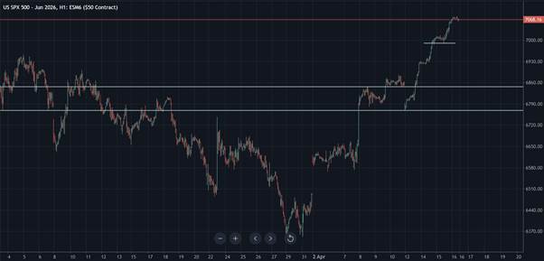 The S&P 500 trading above 7,000 is significant both as a technical milestone and as a fundamental one. Technically, it represents recovery highs that extend well above the support levels that were being tested during the blockade announcement on Monday. The index has recovered from the 6,767 retest of Monday through 6,900 on Tuesday and now to 7,000-plus, a move of approximately 230 points in three sessions on the back of the ceasefire extension reports and the multi-front diplomatic signals of today.